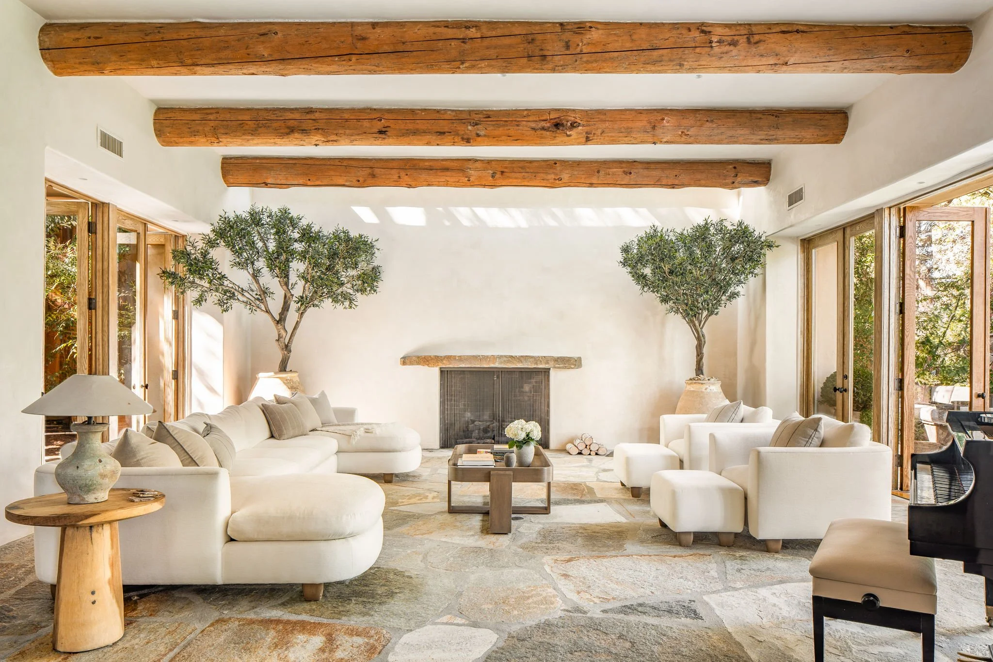 As one of our favorite staging endeavors, Mandeville Canyon was a dream project. This unique home nestled into the hills of Brentwood is a nature scape and an outdoor retreat, offering reprieve from the bustling city. Because the architecture is so visually striking, we were careful to maintain the organic essence of the home and pare down the furnishings to highlight the expressive and dramatic qualities of the materials. We elevated the interiors through earthy textiles, quality furnishings, and handmade accessories, using a neutral color palette to imbue the space with a nostalgic serenity.